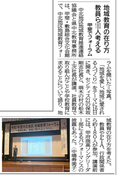 センティス21では、地域の安全を守る活動とともに、人づくりを大切にした取り組みを進めています。このたび、教職員の方々や関係機関の皆さまに向け、人づくり・職場づくりをテーマにした講演を行う機会をいただき、その様子が紹介されました。今後とも、地域の皆様と共に学び合いながら、山梨の一企業として、より良い取り組みを目指してまいります。