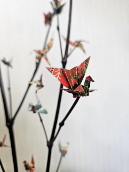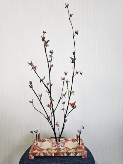 当社の技術スタッフが お取引先様より心のこもった素敵な作品をいただきました和柄の紙で丁寧に折られた折り鶴は空を舞うような立体感を持ち黒い枝に優雅に飾られていますさらに 台座まで美しく仕上げられ細部にわたりお心遣いが込められています
